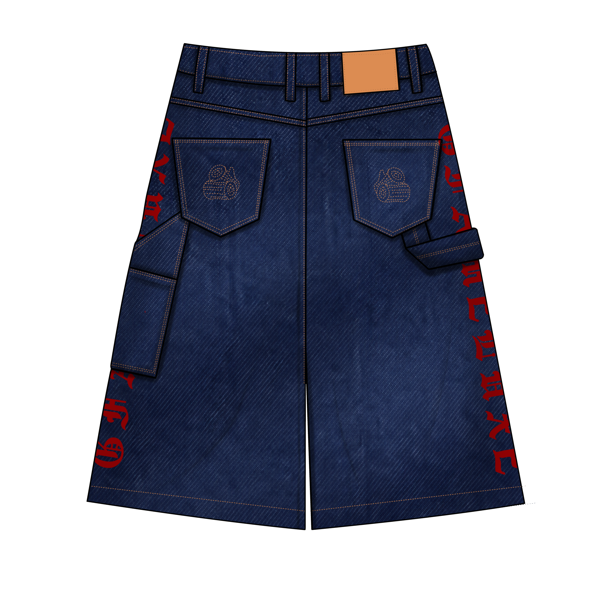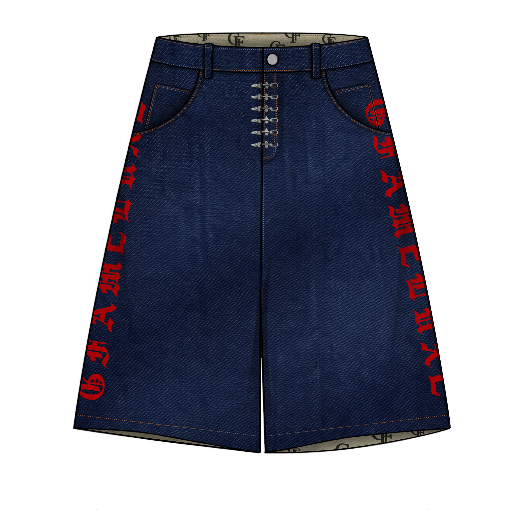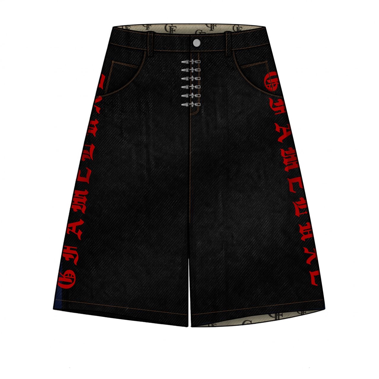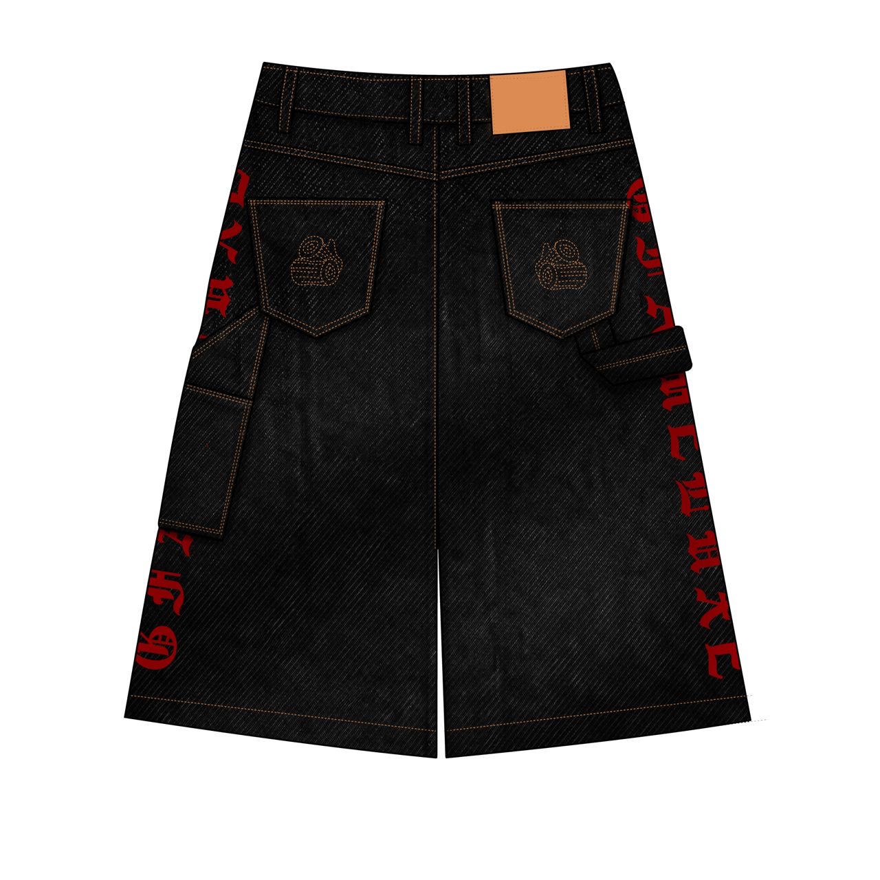 Be the first to review “GFAMELUXE “RED SCRIPT LOCK” DENIM JORTS” Cancel reply